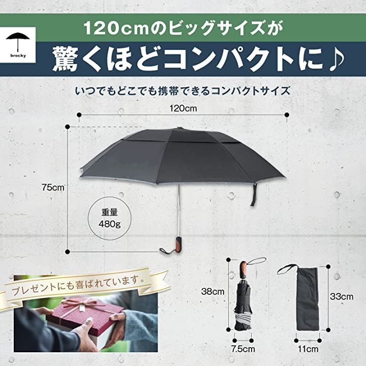 「120cmのビッグサイズが驚くほどコンパクトに*」<開放時のサイズ> 幅:120cm 高さ:75cm <収納時のサイズ> 幅:7.5cm 高さ:38cm <傘本体の重量> 480g <収納ケースの寸法と重量> 寸法:幅11cm 高さ33cm 重量:40g