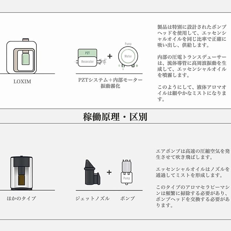 アロマオイルを直接ミスト化するLOXIMアロマディフューザー:内部は水や熱を使わなく、直接にアロマオイルを芳香微粒子に変換し、部屋の有効範囲に香りを広がります。アロマオイルを水で希釈プロセスが省略され、直接に精油を微小な芳香粒子に噴霧し、空気をより持久的で均一な香りが残される効果を実現します