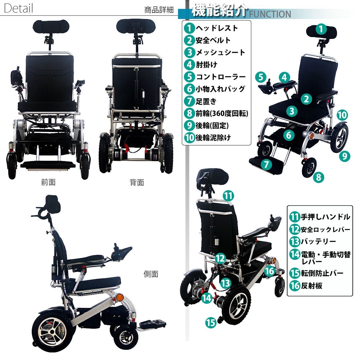 ■材質:アルミニウム(本体フレーム)、PU[ポリウレタン](肘掛け、前輪タイヤ)、PP[ポリプロピレン](安全ベルトバックル、足置き、転倒防止キャスター、バッテリー、泥除け)、ゴム(後輪タイヤ)、オックスフォード布(ヘッドレスト、シート、小物入れバッグ)、アクリル(反射板)、リチウムバッテリー(バッテリー)