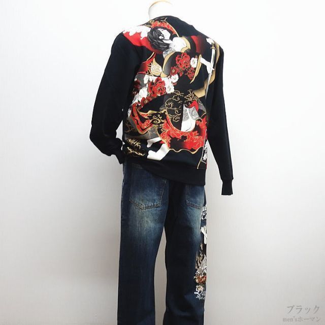 商品名:2022年秋冬物新作【ビッグ有】抜刀娘/バットウムスメ【送料無料】妃那 三日月に斬る 牡丹 ロゴ刺繍 抜染 裏毛スウェット素材 和柄アメカジ トレーナー 黒 M/L/XL/XXL【smtb-k】【ky】父の日【YDKG-k】メンズ【ky】ギフト【RCP】223037