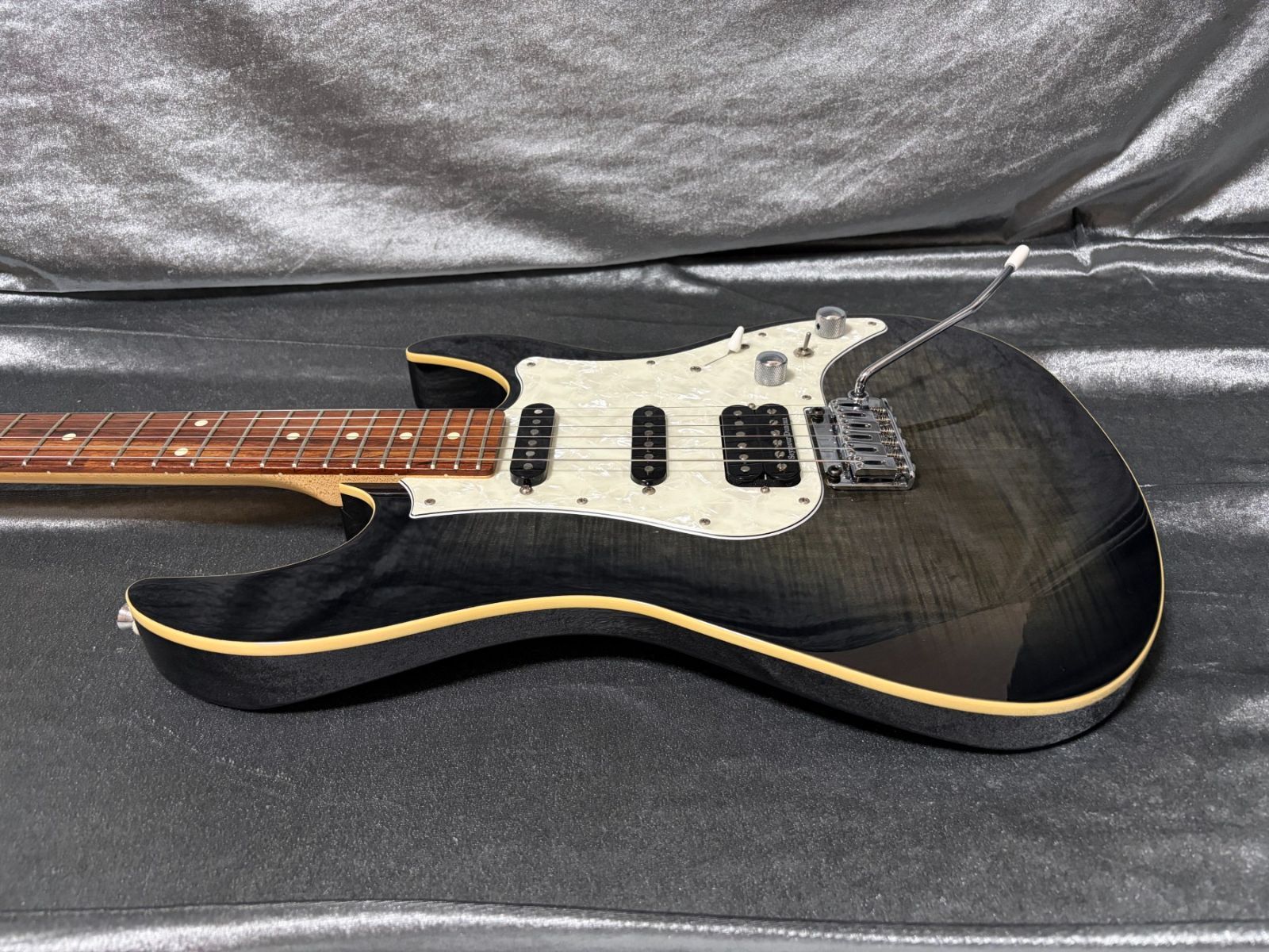 ウッドマテリアルはフレイムメイプルTOP/バスウッドBACKボディ、メイプルネック、グラナディロというハカランダに近い特定を持つ指板を採用、