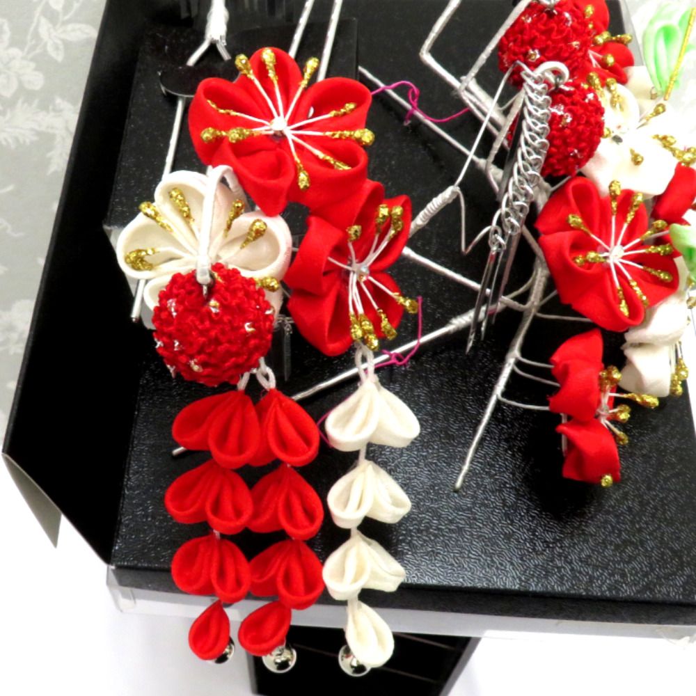 髪飾り・かんざし つまみ細工 丸つまみ 勝山かんざし 3点セット 赤 白 金 銀 女児用 和装 ヘアセット 七五三 お正月 ひな祭り 未使用品