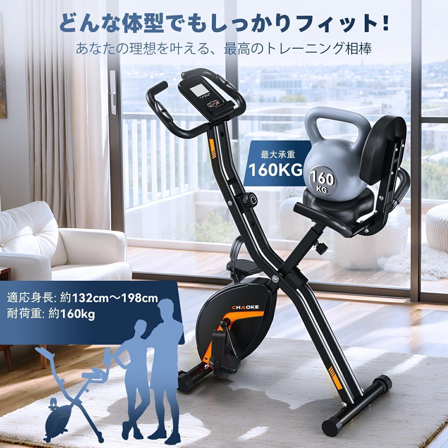 CHAOKEフィットネスバイク トレーニングバイク アップグレード版-5年保証 静音 折りたたみ 16段階負荷 LCDディスプレイ&心拍数メーター付き- 大型サドル コンパクト収納 軽量 タブレットトレー付 小物ホルダー 組立簡単 承重160 kg