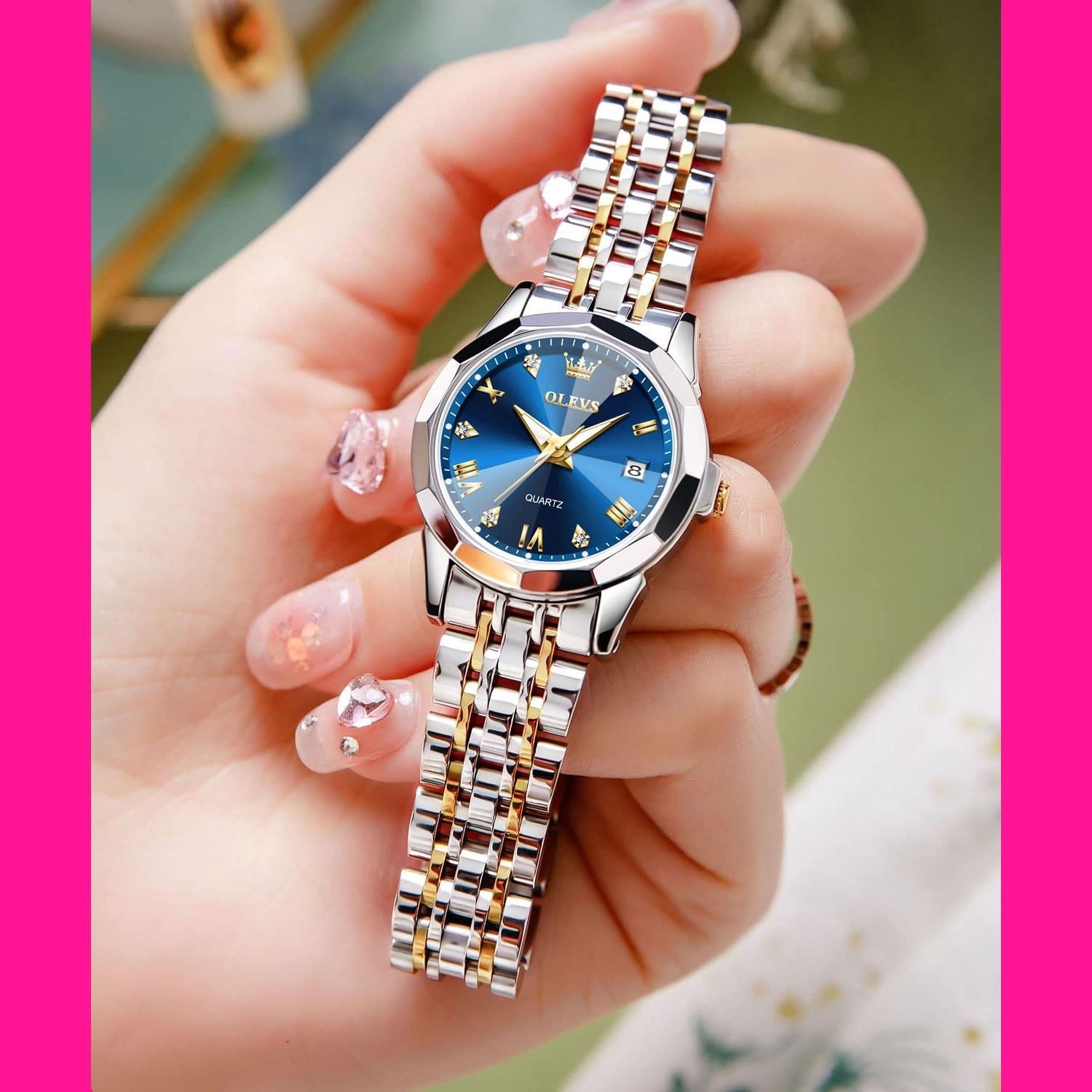 OLEVS 人気腕時計 レディース 防水 ステンレスバンド 女性用とけい腕時計 かわいい 日付 うで時計 レディース ダイヤモンド アナログクオーツ腕時計 青 プレゼント Watch for Women おしゃれ女性腕時計 小さめブルー 文字盤