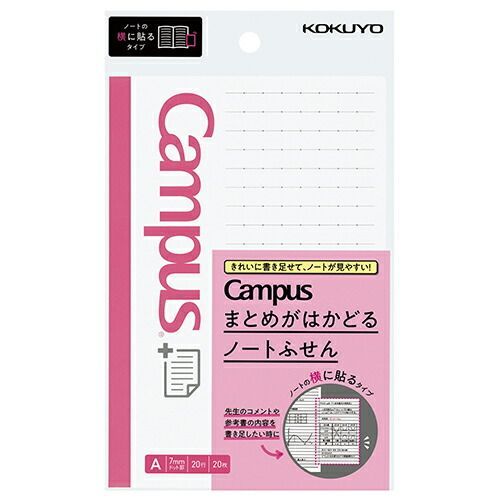 ●キャンパスノートと同じ原紙を使っているから、ノートと一緒に使いやすい。●使用しているノートに合わせて罫線の幅がA罫、B罫から選べる。●ノートに貼っても見やすいサイズ。●きれいに書けるドット罫が両面に印刷されている。●糊(幅8mm)に沿ってミシン目が入っているから、まっすぐつけたせて、何度も折り返してきれいにしまえる。●表紙デザインがキャンパスノートとマッチするから、一緒に持ち運びやすい。●サイドタイプは、先生のコメントや、参考書の内容を書きたしたいときに活躍。【検索キーワード】#kokuyo#キャンパス#付箋#テレワーク