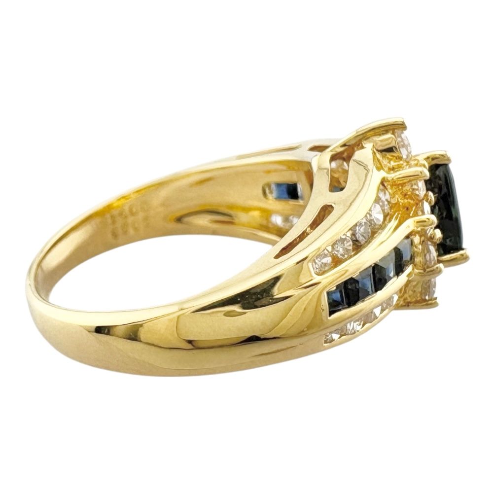 深いブルーのサファイアが、ダイヤモンドの輝きに囲まれて存在感を放つリングです。K18イエローゴールドの華やかな光沢が、手元を一層美しく彩ります。日常のコーディネートに、洗練されたエレガンスを添える逸品です。