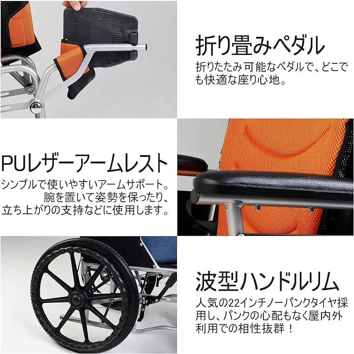 PIPIBEAR 車椅子 折り畳み式 アルミ製 介助 自走 兼用 簡易 コンパクト 介助ブレーキ付 収納ポケット付き オレンジ