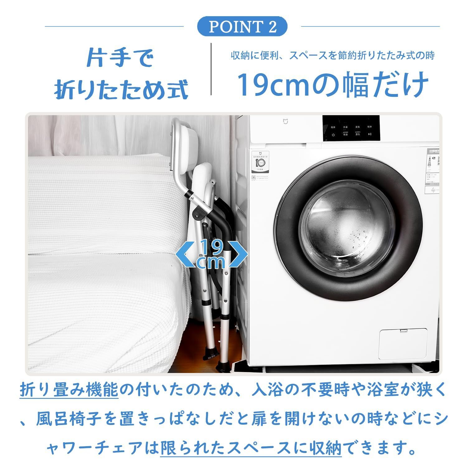 .【組立簡単&省スペース】このシャワーチェアは工具なしで簡単に組立てできます。シャワーチェアは折りたたみ式で、省スペース設計を採用し、19cmの幅だけで置け、狭い浴室にも収納しやすいです。隅に立てればほぼスペースを取らず、使用する時展開だけで組立が不要です。