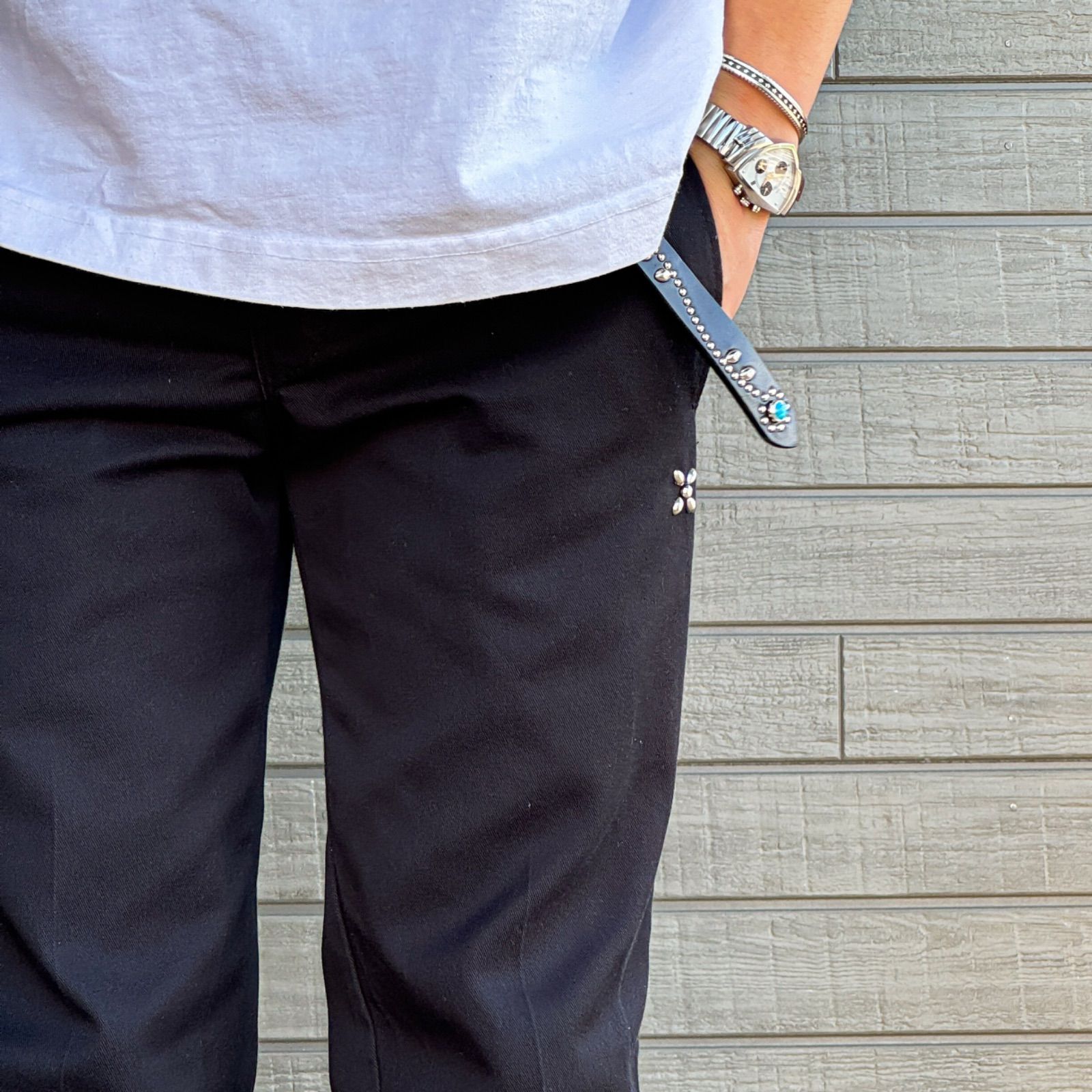 ▪︎HTC.RRL.CALEE等にも使用されるスタンダードリベット社の高級スタッズとナローベルト用にタンナーより取り寄せた厚手のカウレザーを使用して製作したハンドメイドのベルトになります。