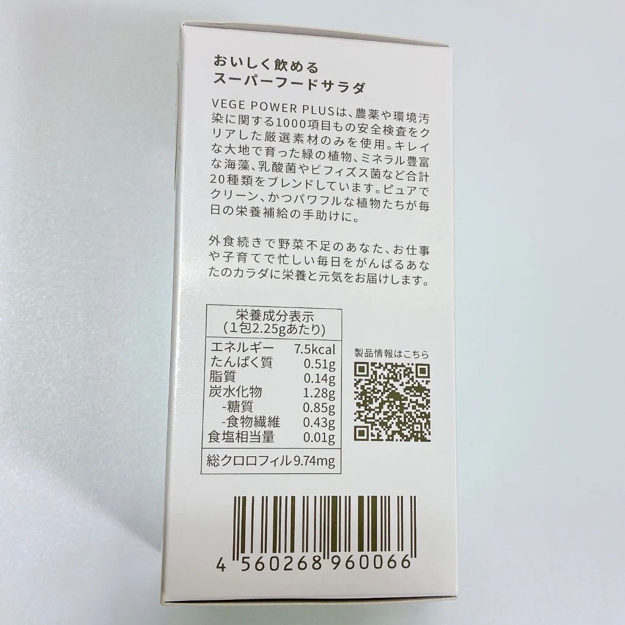 アルファルファジュースパウダー、チコリ、スピルリナ、小麦若葉 、燕麦若葉 、大麦若葉、緑茶、クロレラ、米ぬか、ウチワサボテン、パイナップルパウダー 、ショウガ 、ケルプ(海藻エキス) 、ダルス(海藻エキス) 、アロエベラ、乳酸菌(ラクトバチルス ガセリ、ビフィドバクテリウム ロングム、ビフィドバクテリウム ビフィダム) 、ユッカ 、甘味料(ステビア)