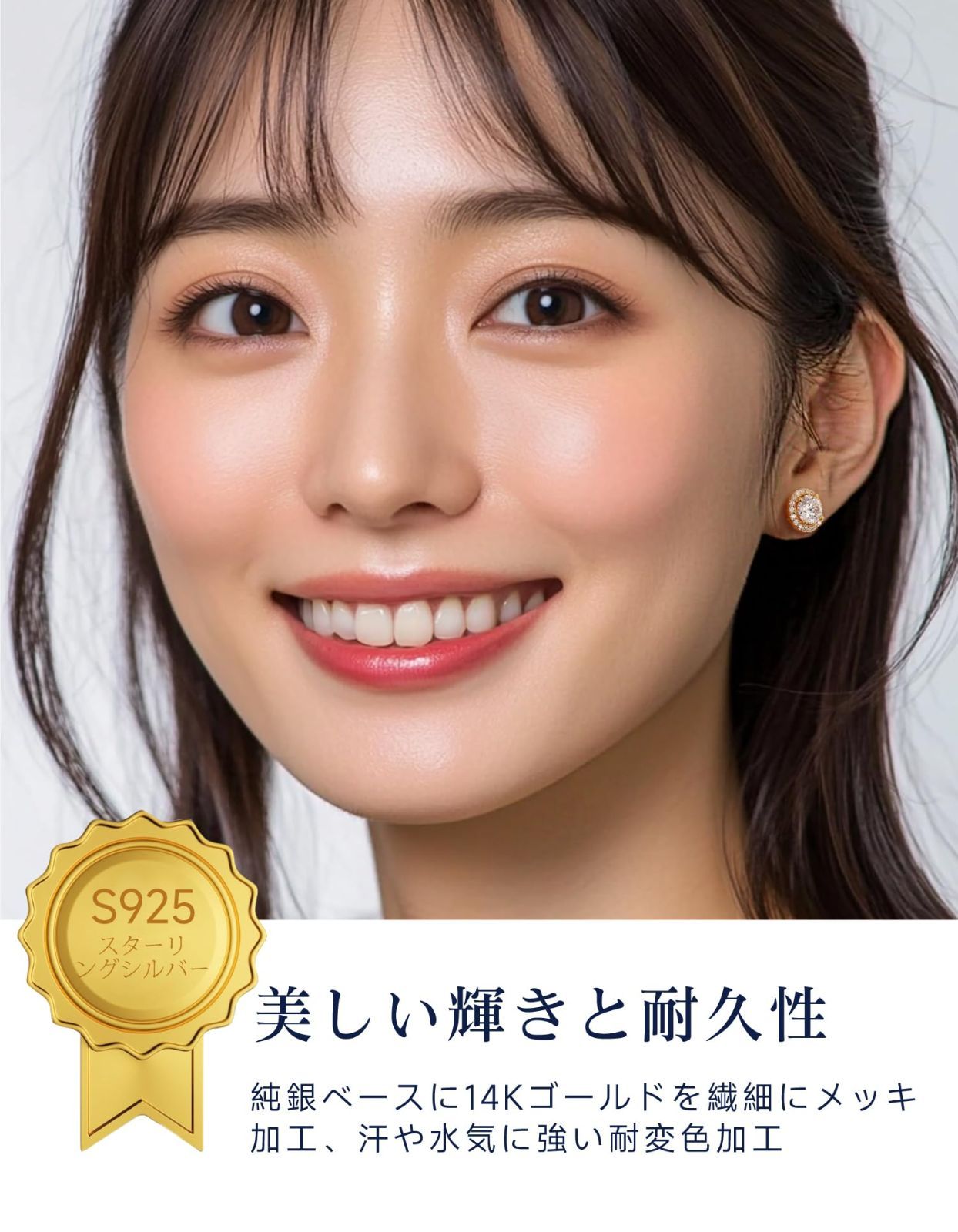 レディースピアスの安心材料: 18金 ピアス 金属アレルギー対応を徹底したシルバー925を採用。ポスト部に0.8mm金メッキを追加し、ピアスレディース人気の秘密である「24時間負担ゼロ」を実現。1.8g軽量設計が長時間装用を可能にします