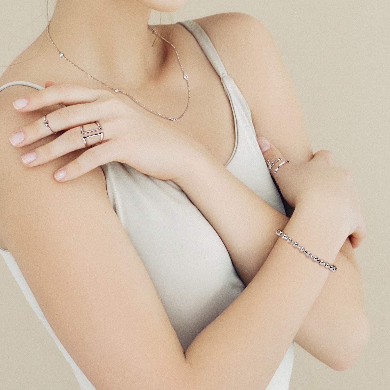 「洗練は複雑さを超越し、当社の伸縮性のあるスターリングシルバービーズブレスレットがそれを証明しています-これは一流のイラストです。この魅力的な伸縮ブレスレットは、交互に配置された3mmと5mmの925スターリングシルバービーズが透明なゴムと絡み合い、優雅さと多様性を演出しています。ブライズメイドのギフトやブライダルアンサンブルのアクセントとして理想的なこれらのスターリングシルバーブレスレットは、永遠の魅力を放っています。今日お手元にお届けし、あなたのジュエリーコレクションを高めてください。」