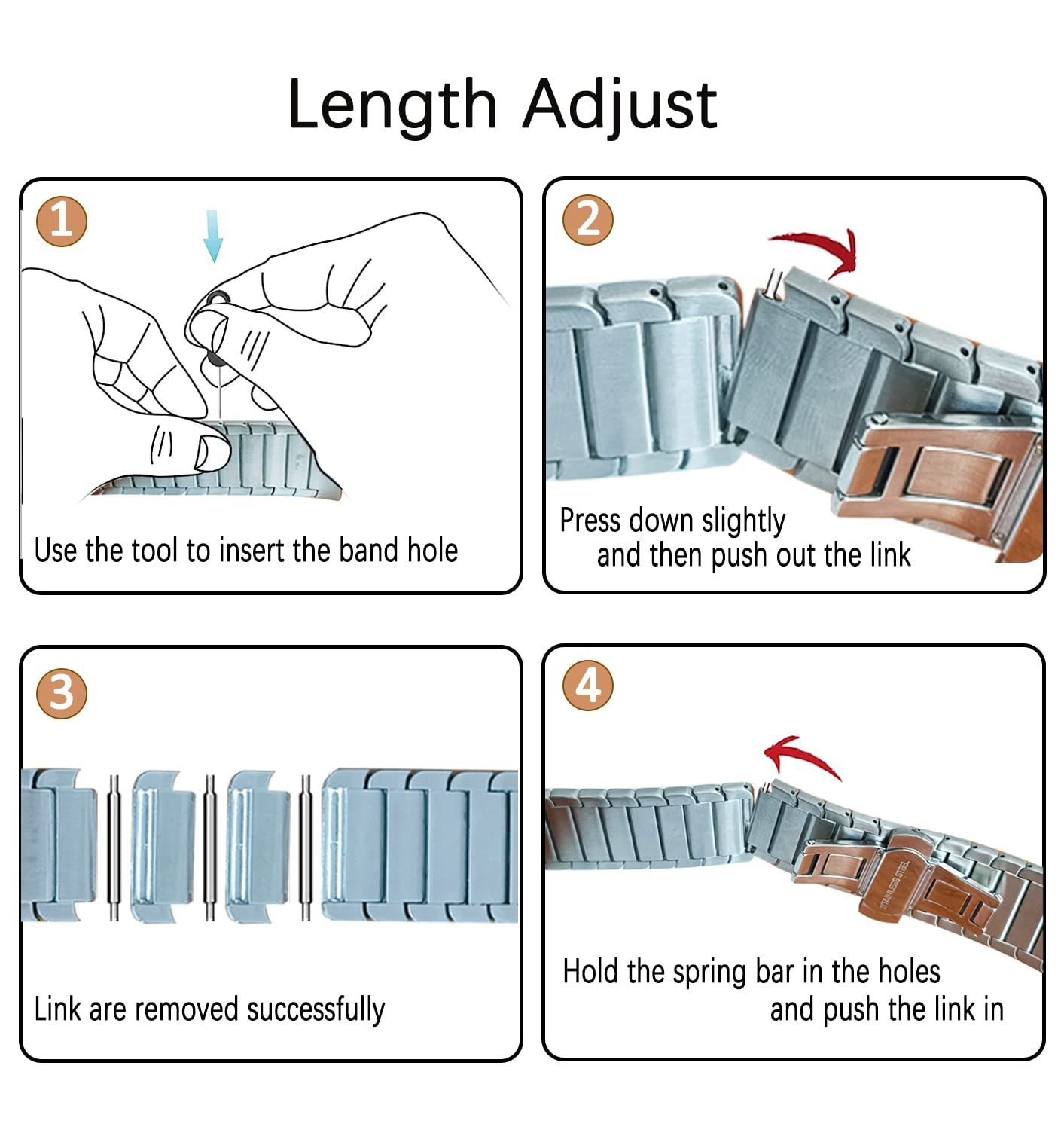 【長さ調整】ストラップは簡単に調整できるように設計されており、パッケージに組み込まれているカードピンを使用してストラップの側面の穴に挿入し、リンクを少し引っ張って外します