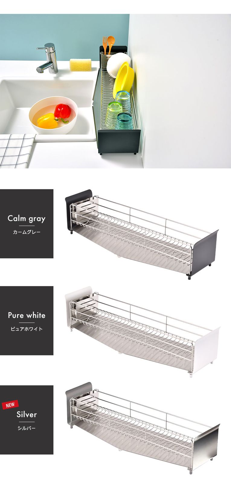 幅広設計で2~3人分の食器をしっかり収納できるロングタイプの水切りラック。底面には特許出願中の波型ワイヤー「たてよこウェーブ」を搭載し、食器を縦・横どちら向きでも安定して置くことが可能。専用トレーは自動で水を流してくれるため、排水の手間を省き、取り外して丸洗いできるので清潔に保てます。シンク上をまたいで設置できる幅広サイズ(シンク幅により異なります)で、限られたスペースを有効活用。脚には高さ調整機能と滑り止め付きで安定性も抜群。お椀なども収まりやすく、見た目もスッキリしたデザインです。