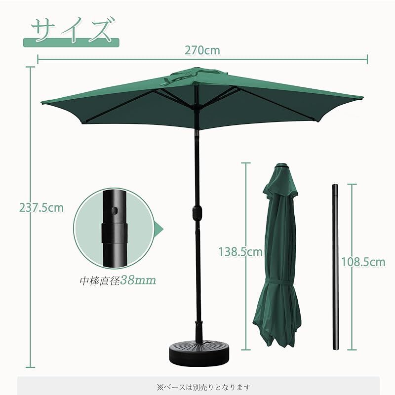 【商品仕様】:「サイズ」直径270cm×高さ237.5Cm 「中棒の直径」38mm 「傘生地」180Gポリエステル 「傘骨」8本 *ディスプレイや写真の光の加減や角度により実物の色が多少異なる場合があります。ご注意:本製品はパラソル本体のみ、ベースは別売りです。