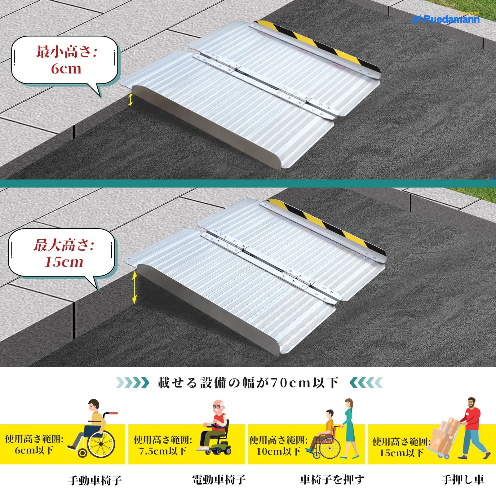 Ruedamann 車椅子 スロープ 長さ61cm 幅76cm アルミスロープ 耐荷重300kg 折りたたみ 軽量 段差解消 持ち運び便利 車いす スクーター シニアカー 室内外 敷居 階段 介護用