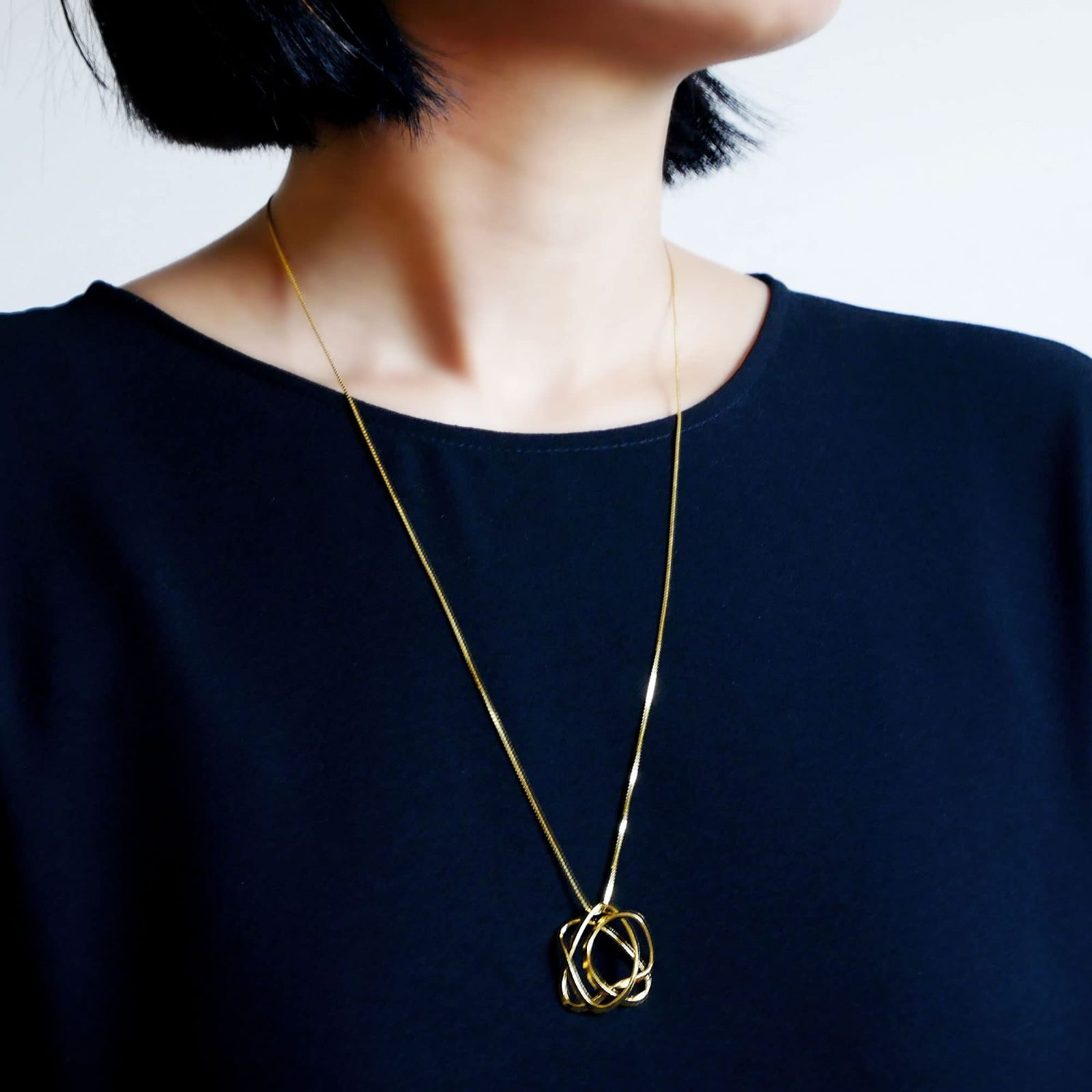 京都・平安神社に作られたパビリオン「GURU-GURU」(ぐるぐる)がデザインソース。吉野杉の曲木によるパビリオンをシルバーで表現したシリーズです。ひとつながりのラインをぐるぐると巻いたような立体感の中に、木材のハリやたわみを感じさせる大胆なデザインはこれ一つでコーディネートの主役に。地金の表面はあえてピカピカに磨き上げないことで、木の持つ柔らかなテクスチャを表現しました。60cmと長めのチェーンはスライドアジャスター付きで、お好きな長さに調整できます。